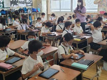 2年1組の国語の様子です。単元は「ことばで絵をつたえよう」です。聞く人にわかりやすい順序で説明する力をつける学習です。タブレットを活用して取り組んでいました。