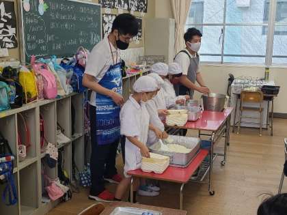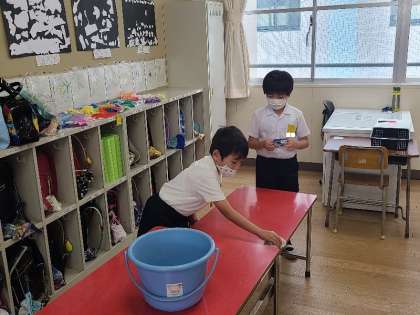 2年2組の様子です。給食台をきれいに拭いています。配膳当番の児童もしゃべらず頑張っていました。