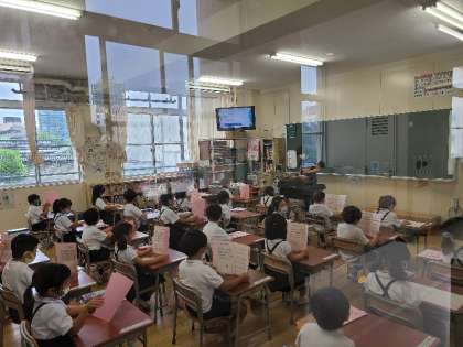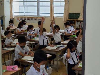 1年1組の音楽では校歌を歌いました。1年3組の国語ではしっかりと手をあげて授業に参加できていました。