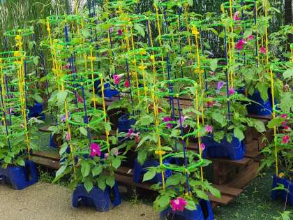 1年生の朝顔がたくさん咲きました。雨で少ししおれていますがとてもきれいです。