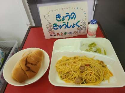 今日の給食は、チキントマトスパゲッティ、グリーンアスパラガスとキャベツのサラダ、発酵乳、パン、牛乳です。いただきます。