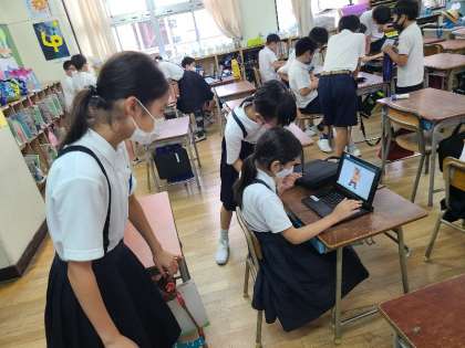 4年2組の様子です。タブレットでお友だちと音楽を聴いたり、漫画のキャラクターでクイズを作ったりしていました。
