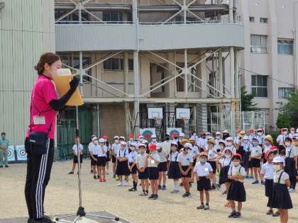 本日運動場で児童朝会を行いました。賞の伝達の後、保健委員より「水分補給の重要性」について、担当の先生より週目標についてお話がありました。今週の目標は「集団登校の時刻を守って登校しよう。」です。