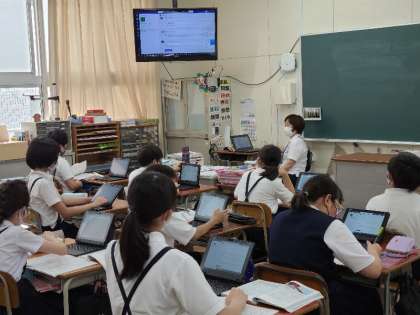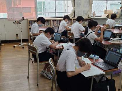 6年1組の国語の様子です。Teamsを活用して自分の意見を投稿していました。いろいろな意見を聴いて自分の考えを深めていきます。