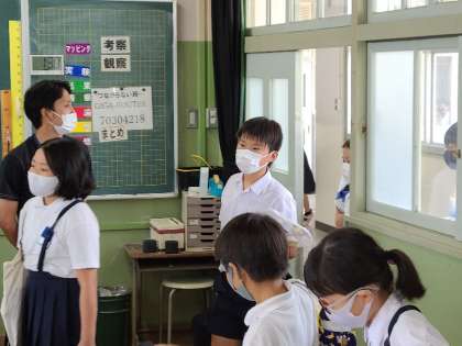 5年1組の理科の授業が始まります。子どもたちは理科室に「お願いします」と言って入室していました。とても良い習慣ですね。