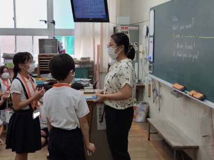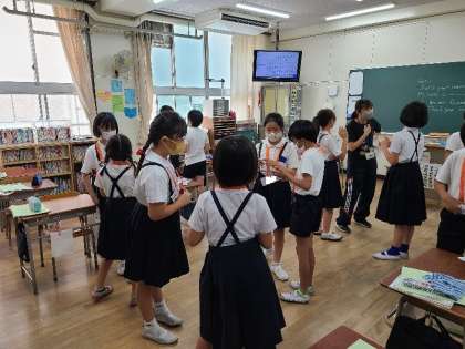 5年2組の英語の様子です。キャラクターカードが自分の名前です。カードは1組です。「Heiio.What's your name?」と互いに名前を確認して、同じ名前のお友だちを見つけます。