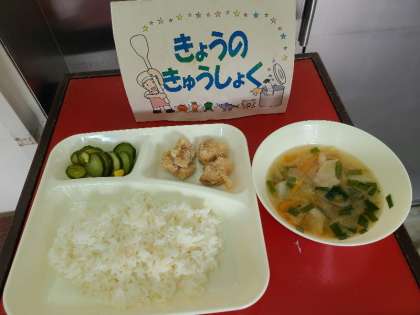 今日の給食は、鶏肉のからあげ、中華みそスープ、きゅうりとコーンの甘酢あえ、ごはん、牛乳です。いただきます。