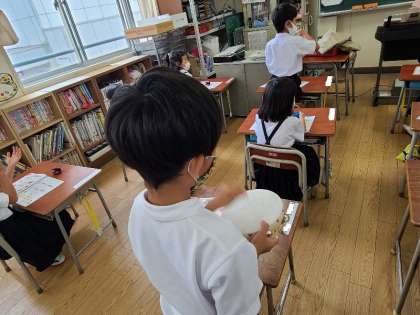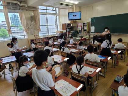 1年1組の音楽の様子です。電子オルガンのリズムに合わせてカスタネットやタンバリンの音を重ねます。リズム感抜群でした。