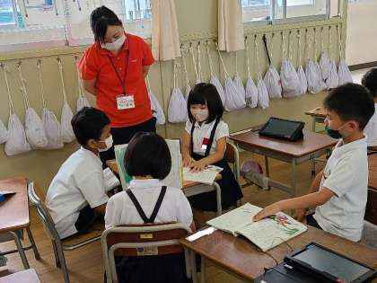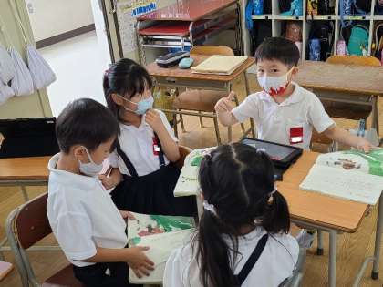 1年3組の国語の様子です。「おおきなかぶ」の音読発表会に向けて、各班毎に話し合っています。元気よく読むところや少し大きな声で読むところ等、どのように工夫するのかを考えました。