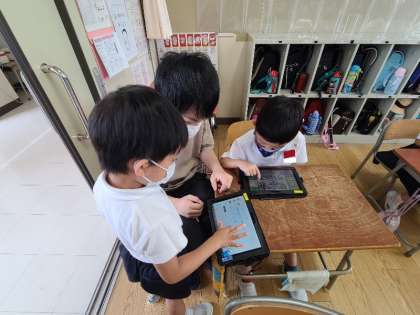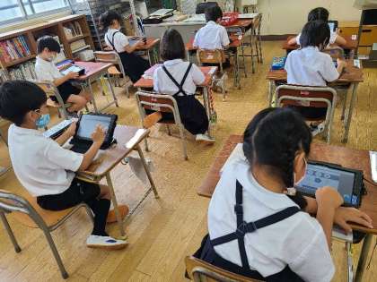 1年1組の様子です。タブレットでデジタルドリル「NABIMA」で学習しています。この後、休み時間も一生懸命に取り組んでいました。