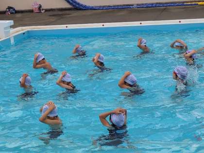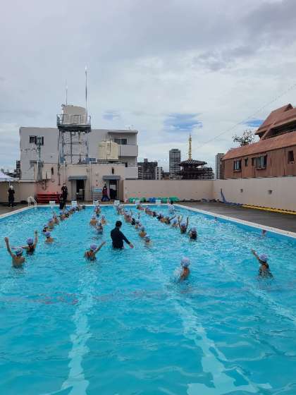 2年生の水遊びの様子です。先生の指示で手を頭の上にのせた状態で浮いたりもぐったりといろいろな動きができていました。プールの底にお尻をつけることができる児童もいました。