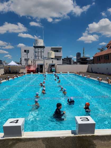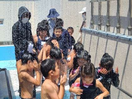 1年1組・3組の水遊びの様子です。「おなか」「ゴシゴシ」「あたま」「ゴシゴシ」としっかりシャワーをした後は、先生の指示でプールに入ります。気持ちよさそうです。