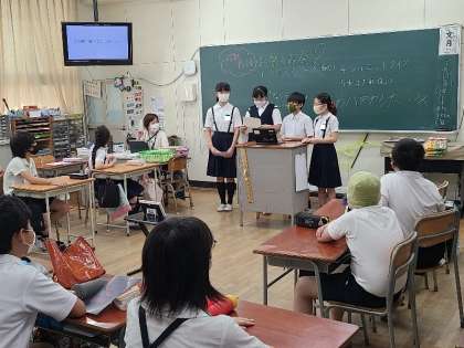 6年1組のお楽しみ会の様子です。タブレットを活用して、アニメや歌、シルエット等のクイズで楽しくすごしました。