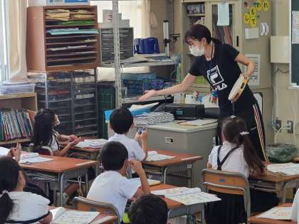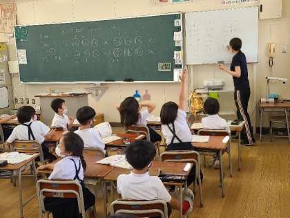1年2組の音楽の様子です。タン・タン・タンならト・マ・トというようにリズムに合わせて好きな食べ物等のことばつなぐ遊びです。