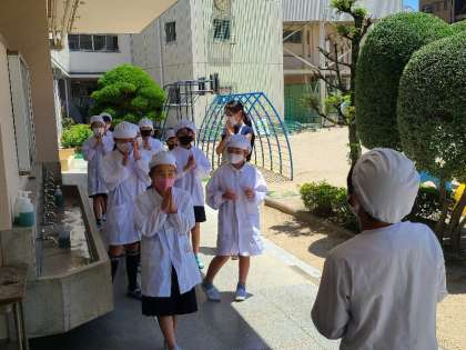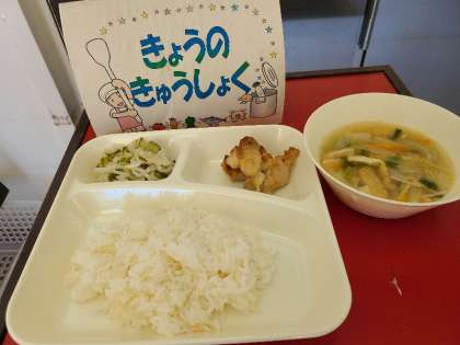 今日の給食は、鶏肉のしょうゆマヨネーズ焼き、五目汁、切干だいこんのゆずの香あえ、ごはん、牛乳です。1学期最後の給食です。いただきます。