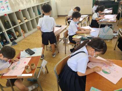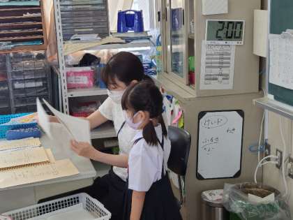 1年2組の様子です。夏休みの宿題等を配布されました。各自で確認をしている間に、一人ずつ担任の先生から1学期の頑張ったところをお話してもらいました。
