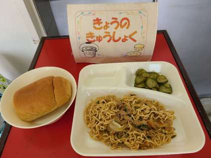 今日の給食は、オイスターソース焼きそば、きゅうりの中華あえ、パン、牛乳です。いただきます。