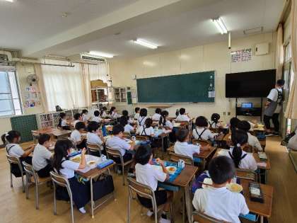 全員前を向いて黙食をしています。(写真は2年2組の様子です。)