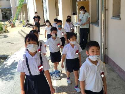 給食終了後は係の児童が、「ごちそうさまでした。給食おいしかったです。」と食器の返却にきます。