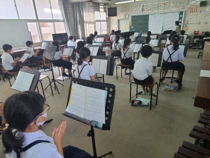 5年1組の音楽の様子です。リコーダーや合唱など、コロナ感染症のリスクの高い活動はできません。リズム奏や音楽鑑賞などの活動をしています。