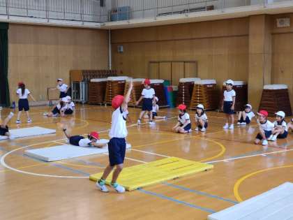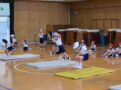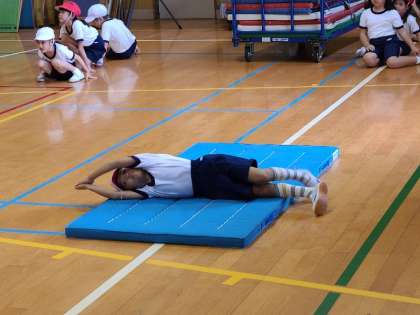 1年1組の体育の様子です。マットを使った運動遊びの様子です。手足を伸ばして体をまっすぐに転がったり、その場でジャンプしたりして楽しく運動遊びを行ってしました。