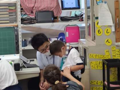 1年生の様子です。先生とお話したりして、みんな楽しくすごしています。チャイムが鳴ると、「早く帰ろ。」と元気にクラスに戻っていました。