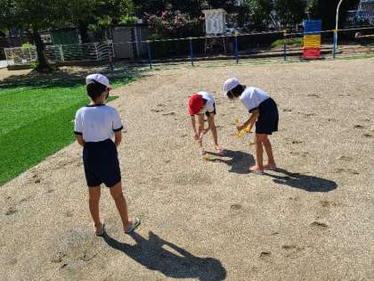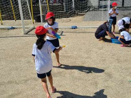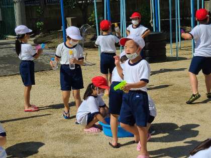 水鉄砲やシャボン玉等で遊びます。運動場に水で絵を描いている児童もいました。
