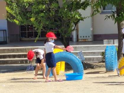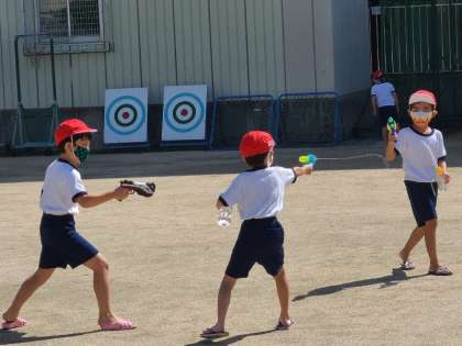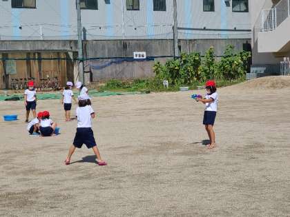 マスクは外さないので、お顔へ水をかけることは禁止でした。皆でルールを守って楽しく遊びました。