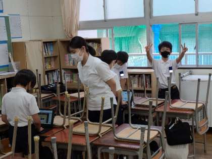 今日から教育実習が始まりました。教室で実習の先生と一緒にすごしています。