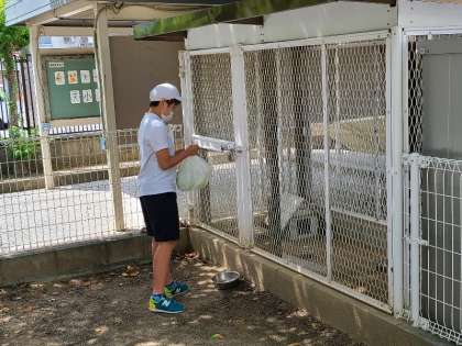 飼育委員がマロンの餌をもってきました。