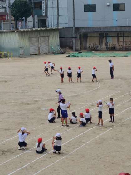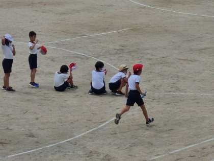 3年1組の体育で、走の運動(リレー)の様子です。サークルリレーや直線でのバトンパスの練習をしていました。