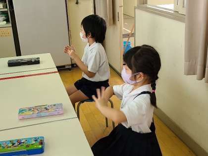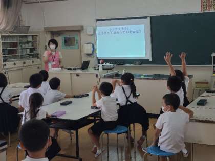1年2組がせいかつかの様子です。養護教諭の太田先生から手洗いのしかたを学習しました。
