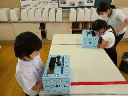 特殊なクリームを塗ってもらい、その後手洗いをします。手の水をふき取り、青いライトを手に当てると、洗えていない部分が白く光ります。みんなしっかり洗うことの大切さを学習しました。