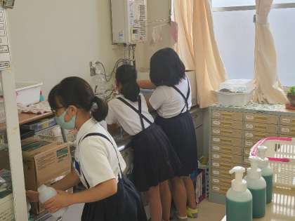 保健委員会の児童が液体洗剤の詰め替えをしてくれています。