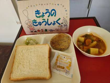 今日の給食は、チキンレバーカツ、ケチャップ煮、キャベツのバジル風味サラダ、パン、牛乳です。いただきます。