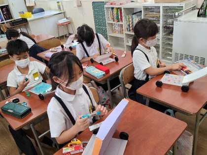 2年2組のヨットカーづくりの様子です。せいかつかと図工をあわせて授業を行っています。素敵なヨットカーができあがってきました。
