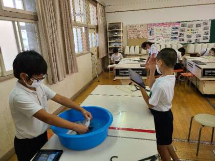 6年2組の家庭科の様子です。普段は洗濯物を洗濯機で洗うことが多いですが、洗濯の大変さや手で洗うことの良さを学びました。洗濯の様子を撮影していました。