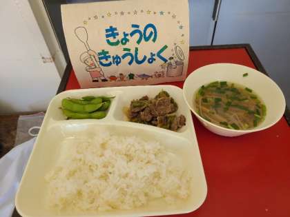 今日の給食は、プルコギ、トック、えだまめ、ごはん、牛乳です。いただきます。