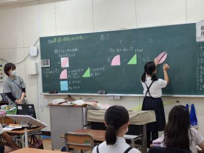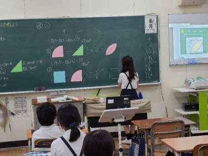 6年生の算数の習熟度授業の様子です。図の面積を求めています。違う考え方の発表で思考した過程を伝え合い学習を深めました。