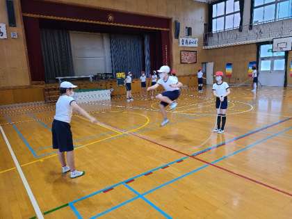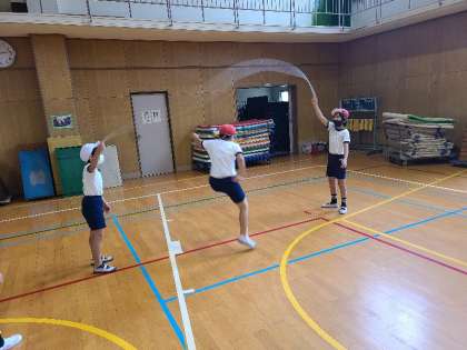 6年1組の体育の様子です。体つくり運動の巧みな動きを高める運動です。長なわを跳んでいます。迎えなわに挑戦する等、条件を変化させて活動していました。