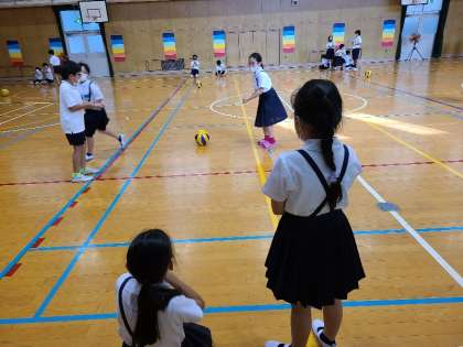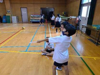 4年2組の理科の様子です。空気の性質を学習した後、空気鉄砲で的当てをしています。