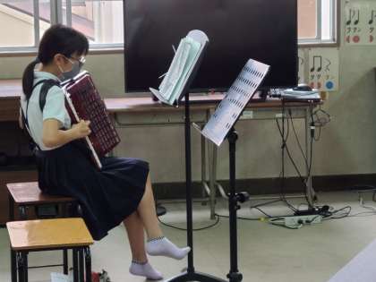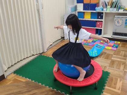 雨で運動場が使えません。残念ですね。なかよしの教室ではバランスボールで遊んでいました。音楽室では合奏のパート練習に取り組んでいました。
