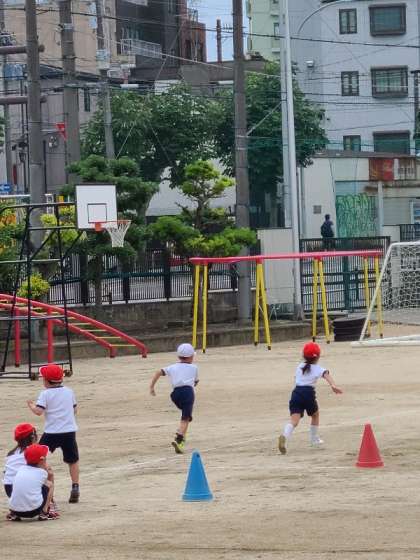 1年2組の体育の様子です。走の運動遊びです。長く真っすぐ走りました。