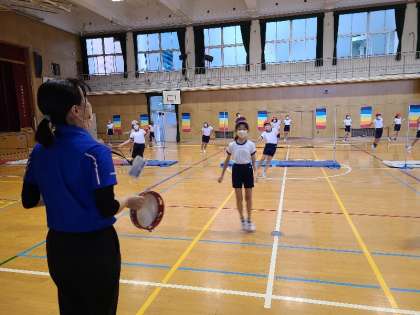 5年1組の体育の様子です。先生の掛け声と反対の動きをするトレーニングで準備運動をしていました。