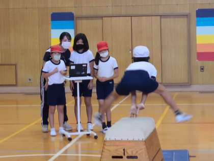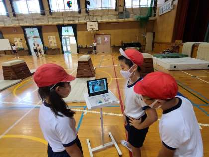 4年1組の体育の跳び箱運動の様子です。運動の様子をタブレットで確認して、互いに意見交換しています。