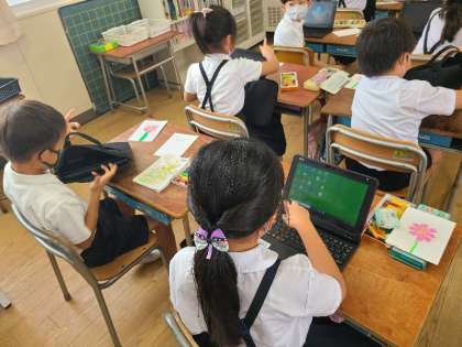 2年1組の図工の様子です。コスモスの表と裏を描いています。裏側はタブレットでコスモスの裏側の写真をさがして描きます。