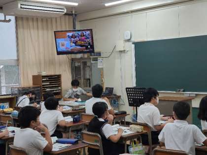 6年2組の英語の様子です。担任の先生がパソコンを操作して映し出されたビデオで学習していました。