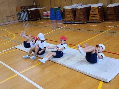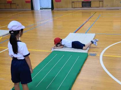 1年3組の体育のマットを使った運動遊びの様子です。ゆりかごや丸太転がりなど楽しく運動遊びを行っていました。