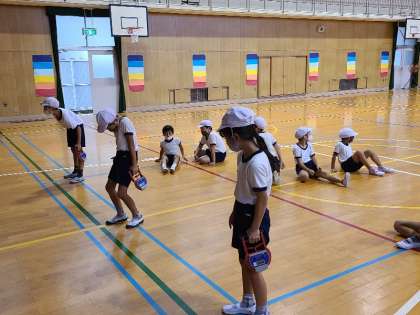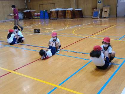 3年2組の体育の様子です。新体力テストの握力と上体起こしの測定をしていました。握力では、気合を入れて測定していました。