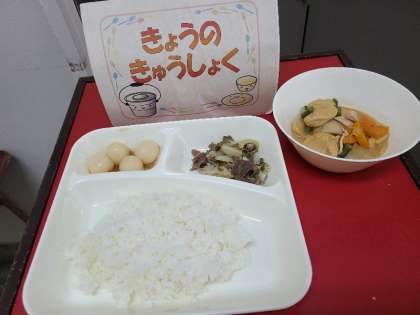 今日の給食は、一口がんもとさといものみそ煮、牛肉と野菜のいためもの、みたらしだんご、ごはん、牛乳です。いただきます。